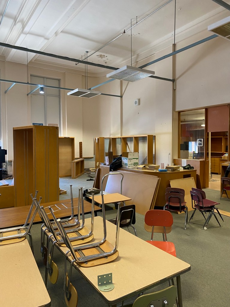 The work moves forward. We even got the old bookshelves from Chisholm elementary.